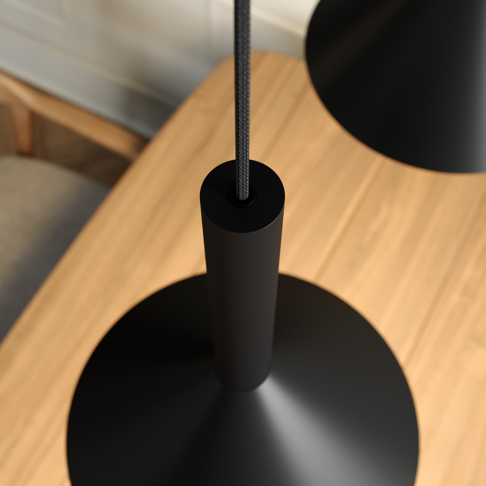 Tadej on modernin pelkistetty, kolmilamppuinen riippuvalaisin, joka sopii hienosti ruokapöydän tai saarekkeen valaisuun. Metalliset varjostimet toimivat heijastimen tavoin, joten valaistus kohdistuu tehokkaasti ja keskitetysti suoraan kohti pöydän pintaa, ja muu ympäristö hyötyy siitä vain epäsuorasti. Häikäisemätön valo lisää ruokailuhuoneen viihtyisyyttä. Varjostinten ulkopuoli on musta ja sisäpuoli valkoinen. Valaisimessa voidaan käyttää kaikenlaisia E27-lamppuja, mutta erityisen hyvin siihen sopivat modernit LED-lamput, joissa on erittäin lämmin valkoinen valoväri. Nämä lamput tuovat tilaan viihtyisää ja kodikasta tunnelmaa.