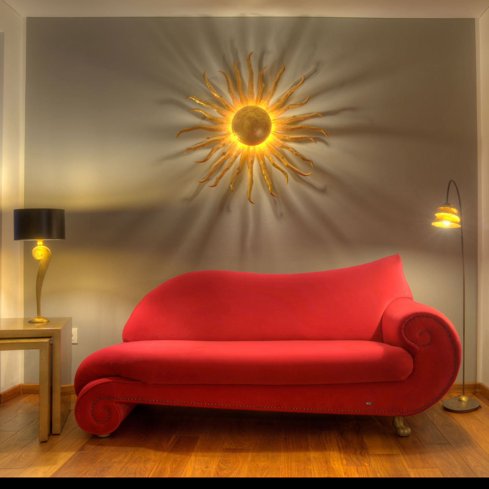 Kaunis lattiavalaisin SNAIL koostuu sirosta rautatangosta, joka johtaa spiraalimaiseen kultaiseen varjostimeen. Metallivarjostin – huolella valmistettu – ympäröi lamppua tyylikkäästi ja antaa lämmintä valoa ja avautuu rikkoen valon kultaisella hehkutuksella.