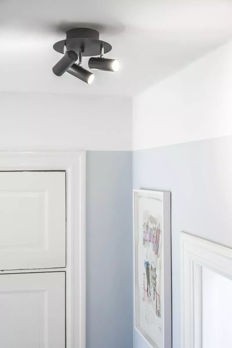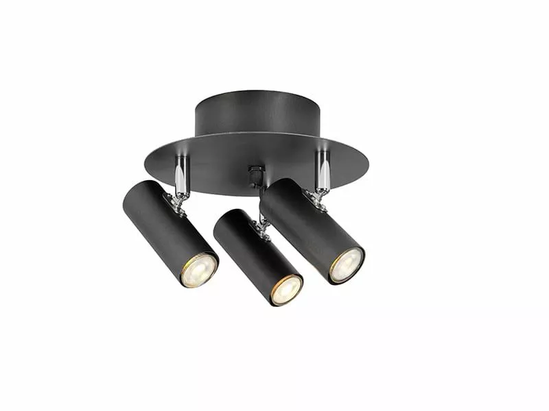 Alpha Slim är en stilren takspotlight i minimalistisk design från Cottex. Grafitgrå rund takplatta med tre slimmade spotlights med fästen i krom.