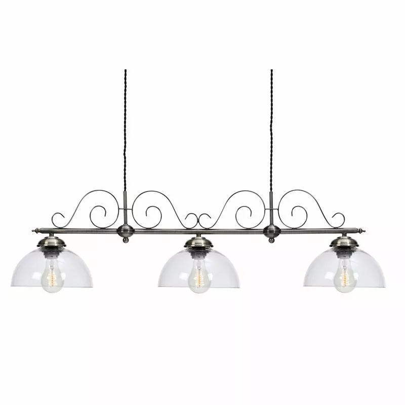 Kaunis kattovalaisin, jossa taottuja yksityiskohtia ja varjostimet kirkasta lasia. Kaunis valaisin kannattaa asentaa keittiönpöydän tai ruokapöydän yläpuolelle. Lampan suosittelee, että uudessa valaisimessa käytetään LED-lamppuja, jotka eivät kuumene ja jotka kuluttavat jopa 90 prosenttia vähemmän energiaa.