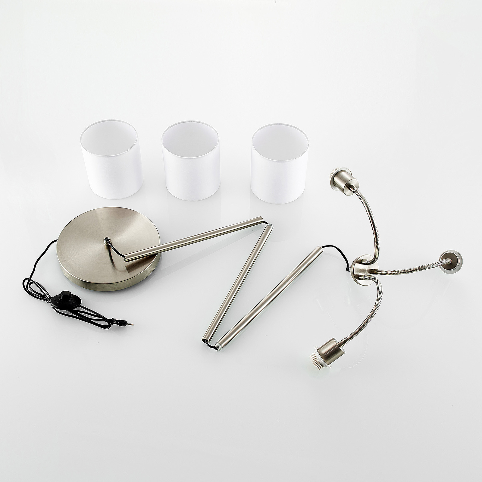 Manu on kaunis lattiavalaisin, jossa on kolme valkoista, kevyesti alaspäin levenevää kangasvarjostinta. Kankaan valkoinen sävy luo viihtyisän valaistuksen. Jokainen varjostin voidaan säätää yksilöllisesti joustoelementtien avulla. Tämän ansiosta valaisin mahdollistaa myös epäsuoran valaistuksen käytön. Hillityn tyylikäs lattiavalaisin sopii moderniin ja myös nuorekkaaseen sisustustyyliin.