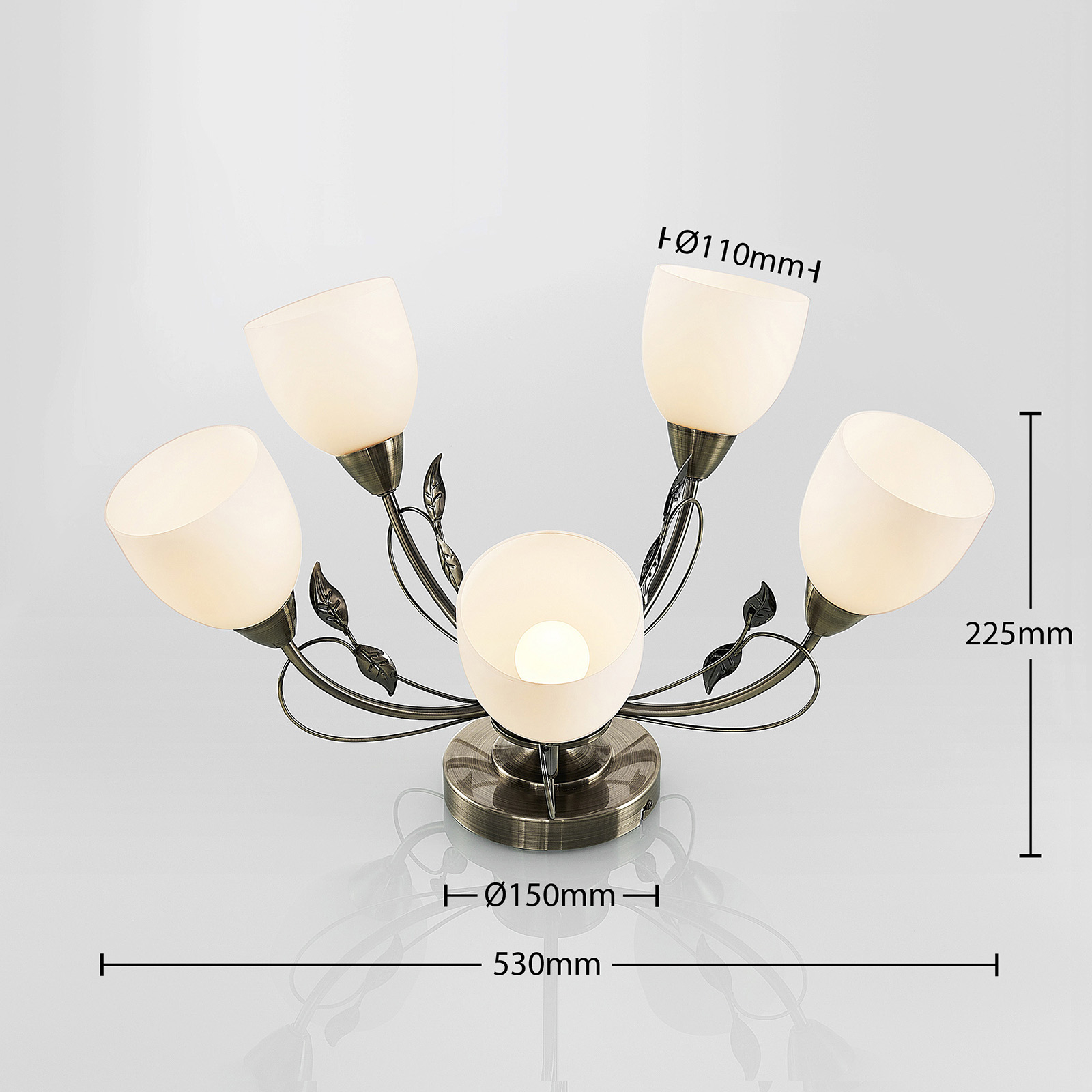 Thaddeus-kattovalaisin sopii erinomaisesti klassiseen tyyliin sisustettuihin huoneisiin. Valaisimessa on kevyt metallirunko: kaarevissa tukipuissa on messinkipinta, ja kaunis lehtikoristelu viimeistelee tyylin. Valkoiset lasivarjostimet luovat tasaisen kodikkaan valaistuksen. Viisi E14-kannan lamppua takaa hyvän valaistustehon. Valaisimen lamput voi valita käyttökohteen mukaan esimerkiksi vaadittavan valaistustehon, energiankulutuksen tai valovärin mukaan.
