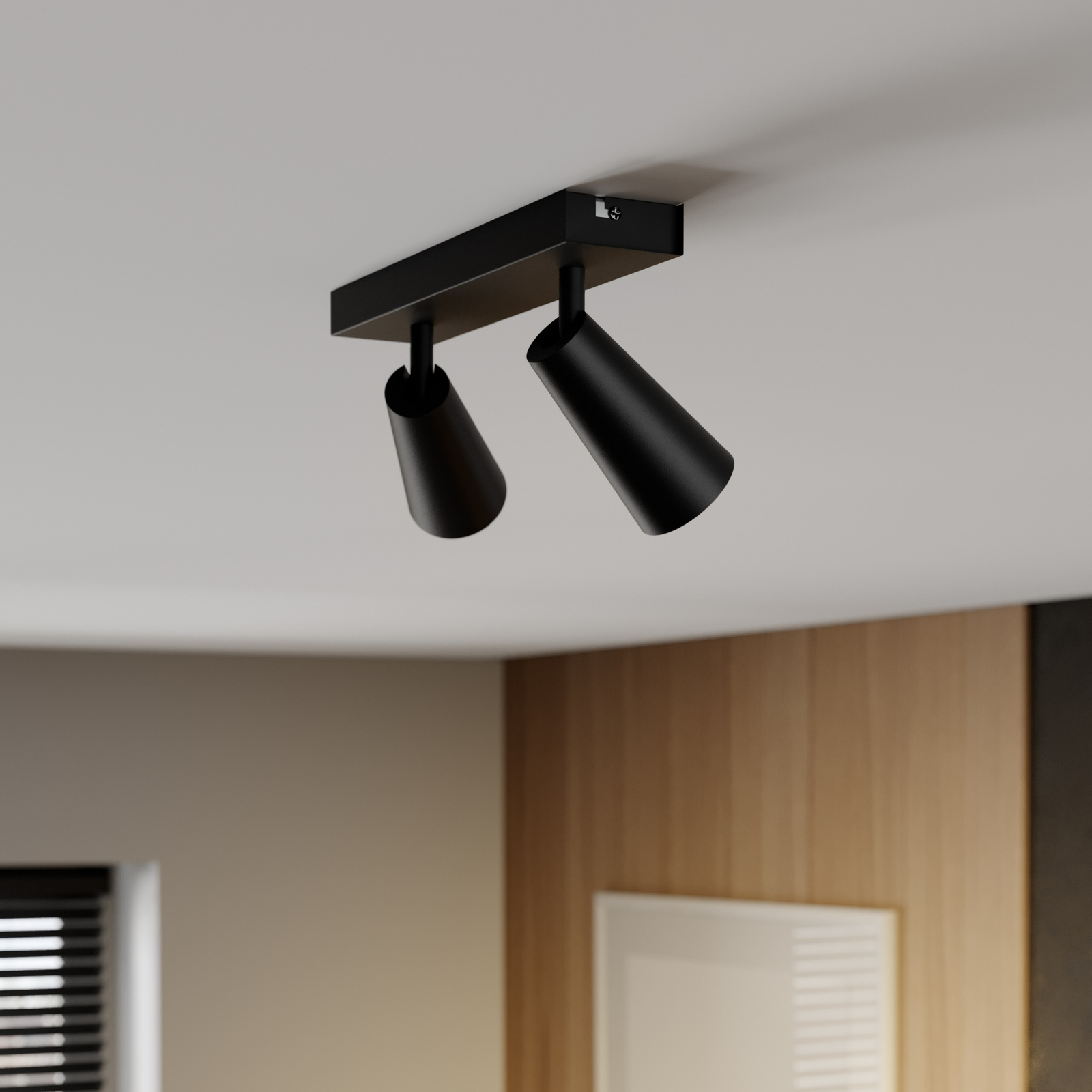 Angelina-kattovalaisimessa on tyylikäs muotoilu. Kattokiinnike on kulmikas ja pitkänmuotoinen ja molemmat varjostimet puolestaan kapeita ja pyöristettyjä. Valaisimen ulkopuoli on kokonaan musta ja varjostimen sisäpuolella on kaunis kullansävy, joka heijastaa valon kauniin lämpimästi. Valojen suuntaa voi tarvittaessa säätää varjostinten välissä olevien nivelten ansiosta. Valaisimessa voi käyttää LED-lamppuja.