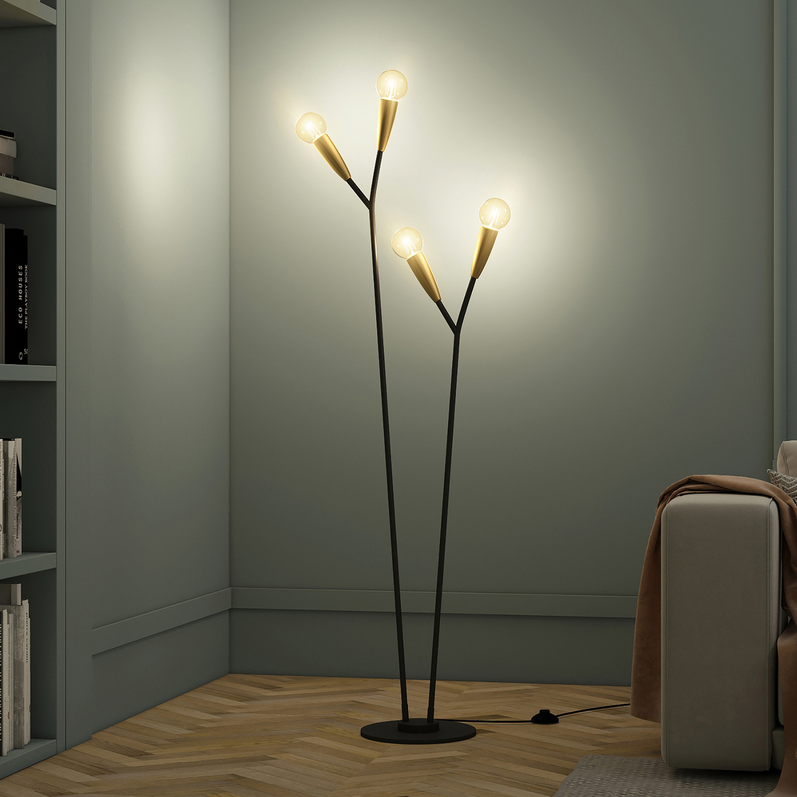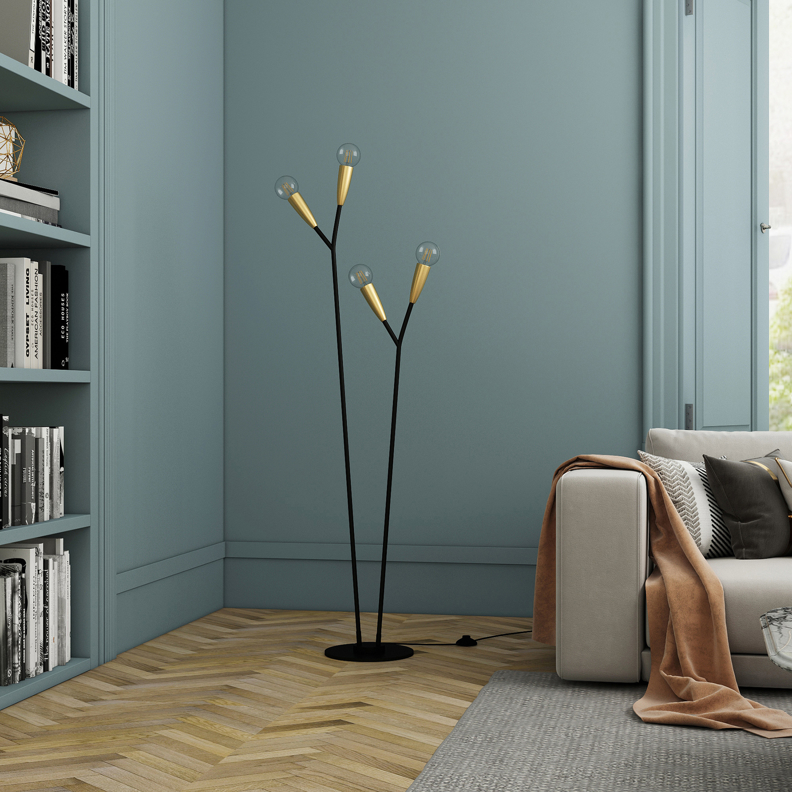 Carlea-valaisin muistuttaa muotokieleltään hieman puun oksia, mikä luo abstraktin mutta luonnollisen vaikutelman. Valaisimessa on ohut pyöreä jalka ja mustat varret sekä messinginväriset lampunpitimet, jotka täydentävät kokonaisuuden tyylikkäästi. Valaisimen neljällä lampulla on tärkeä merkitys kokonaisilmeen kannalta, joten valaisimeen kannattaa valita tyyliin sopivat lamput. Tähän valaisimeen sopivat erinomaisesti energiatehokkaat LED-filamenttilamput, jotka muistuttavat ulkoisesti perinteisiä hehkulamppuja.