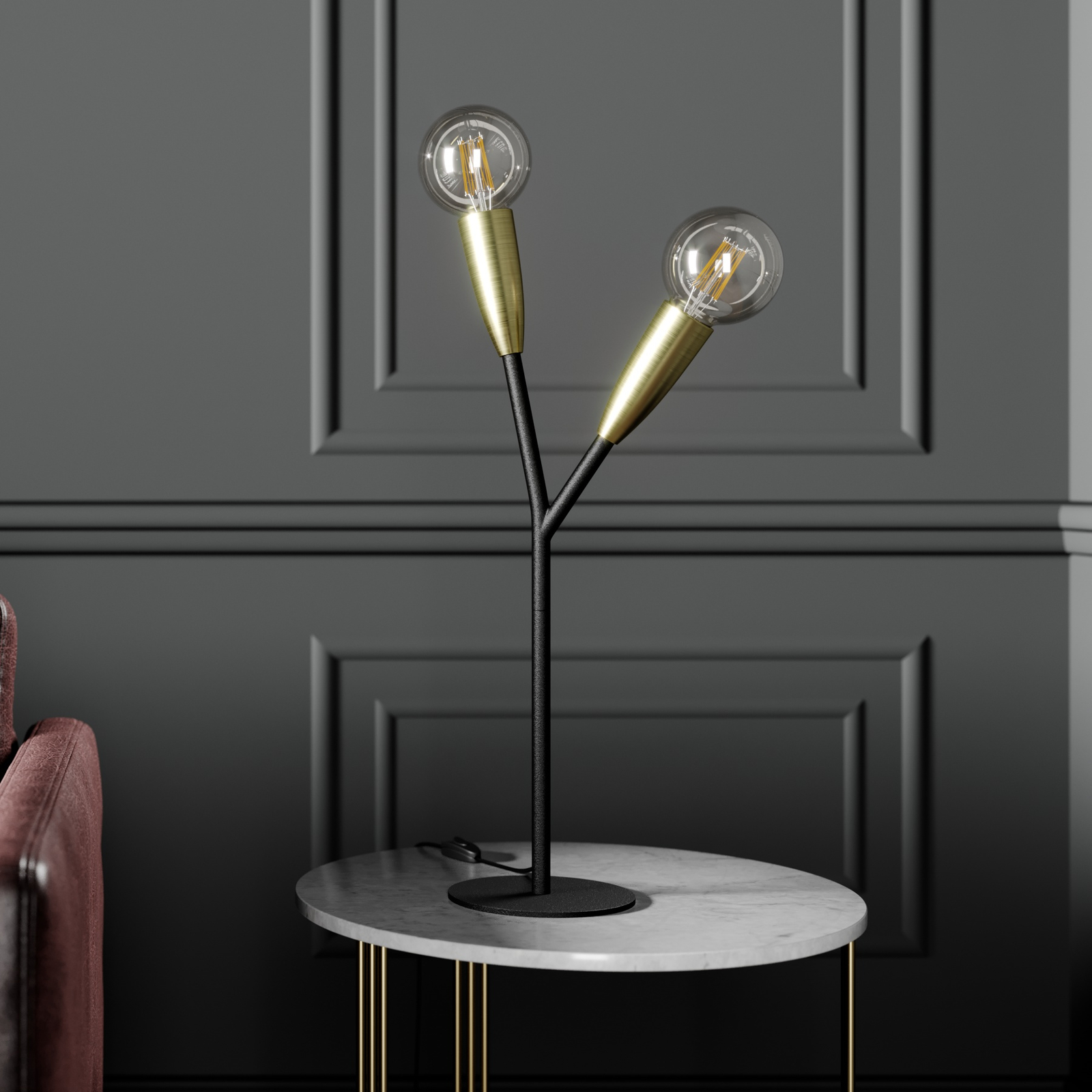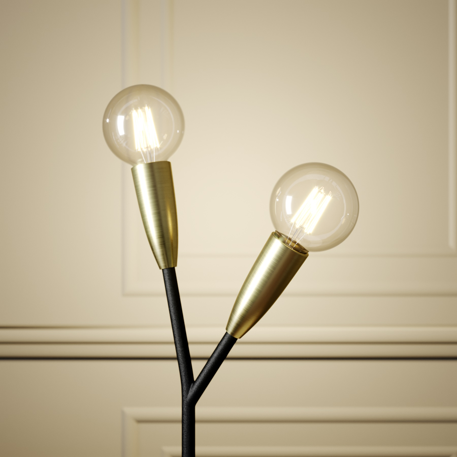 Carlea on moderni ja tyylikäs pöytävalaisin Valaisimen moderni abstrakti muotoilu muistuttaa hieman oksia. Valaisimessa on musta jalka ja runko ja kauniin kontrastin muodostavat, messinginväriset pidinosiot. Koska valaisimessa ei ole varjostimia, E27-lamput ovat esteettä näkyvillä. Valaisimeen kannattaa tästä syystä valita tyylin mukaiset lamput. Valaisimeen sopivat erittäin hyvin perinteistä hehkulamppua ulkoisesti muistuttavat LED-filamentti- tai -rustiikkilamput.