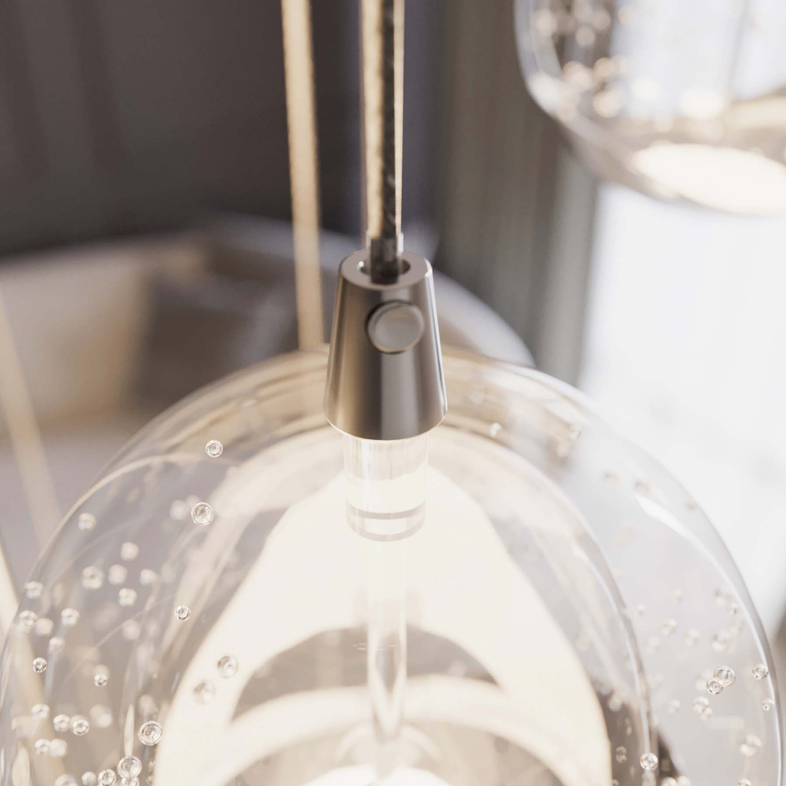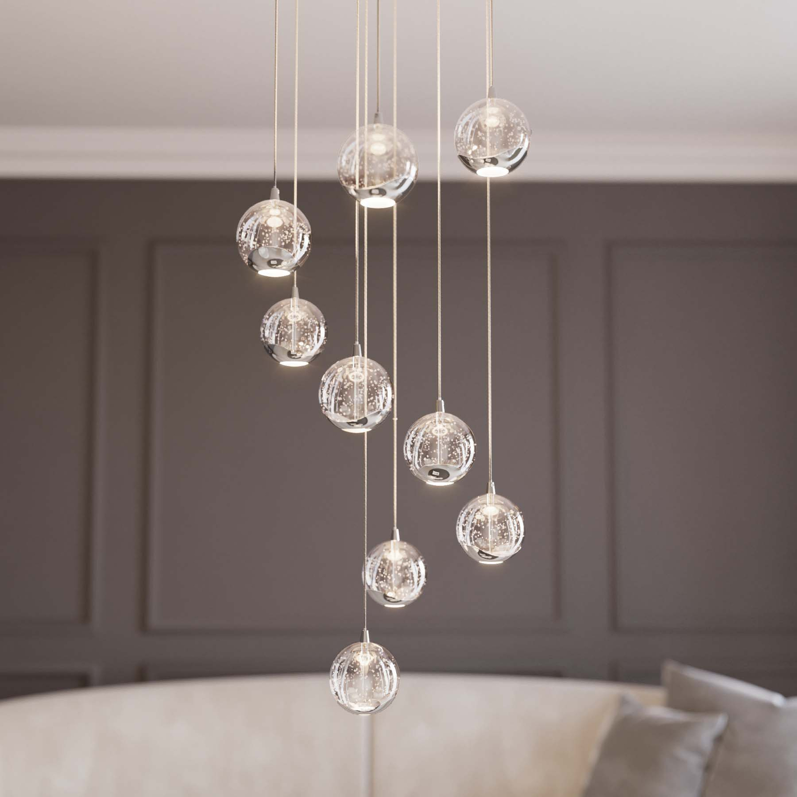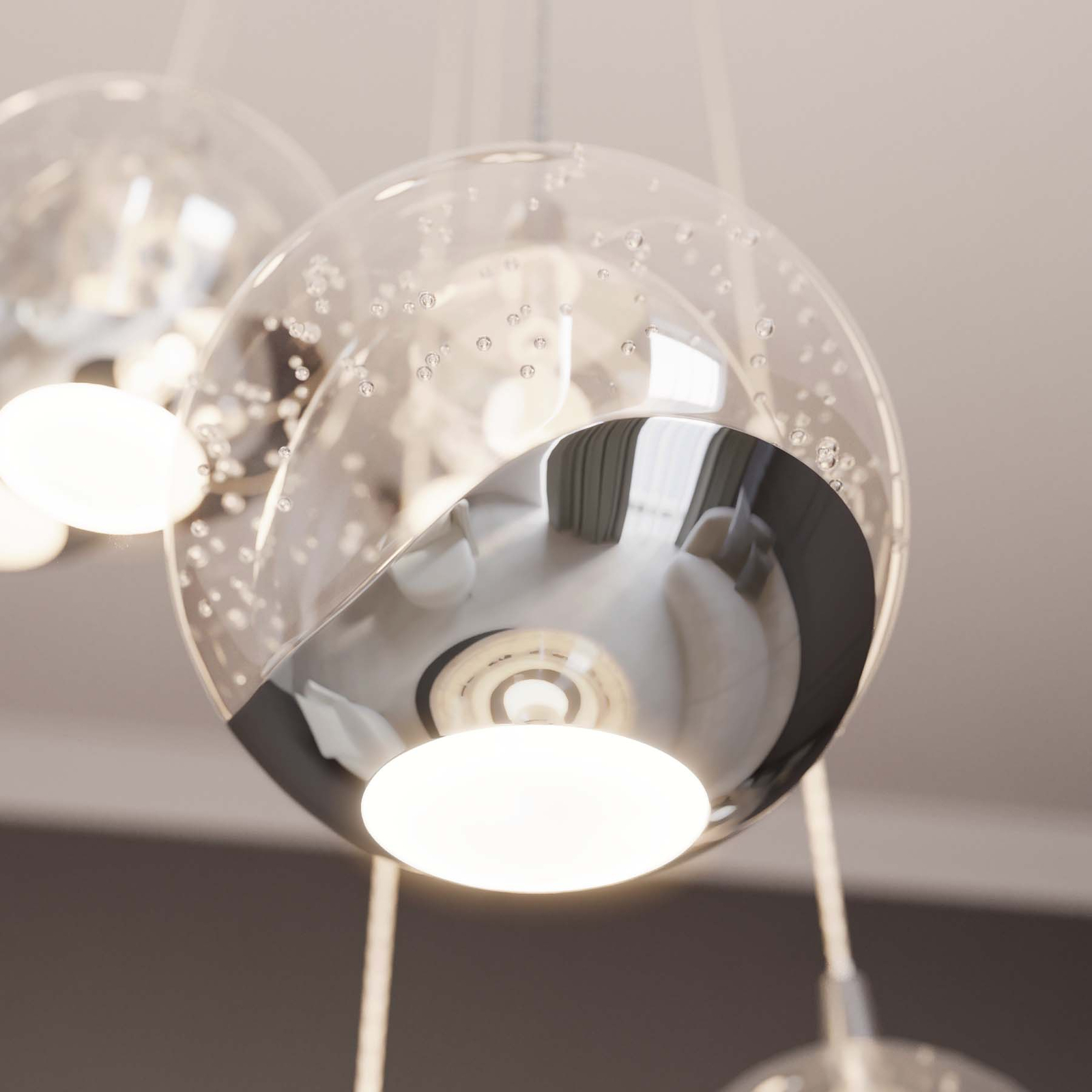 Yhdeksän lasipallon sisäosassa on koristepuhallus ja alapuoli on suljettu metallielementillä. Valaisimen pyöreässä kattokiinnikkeessä on moderni kromattu pinta, joka viimeistelee valaisimen yksilöllisen tyylin. Valaisin toimii näyttävän muotoilunsa ansiosta sisustuksen kauniina katseenvangitsijana myös valon ollessa pois päältä.