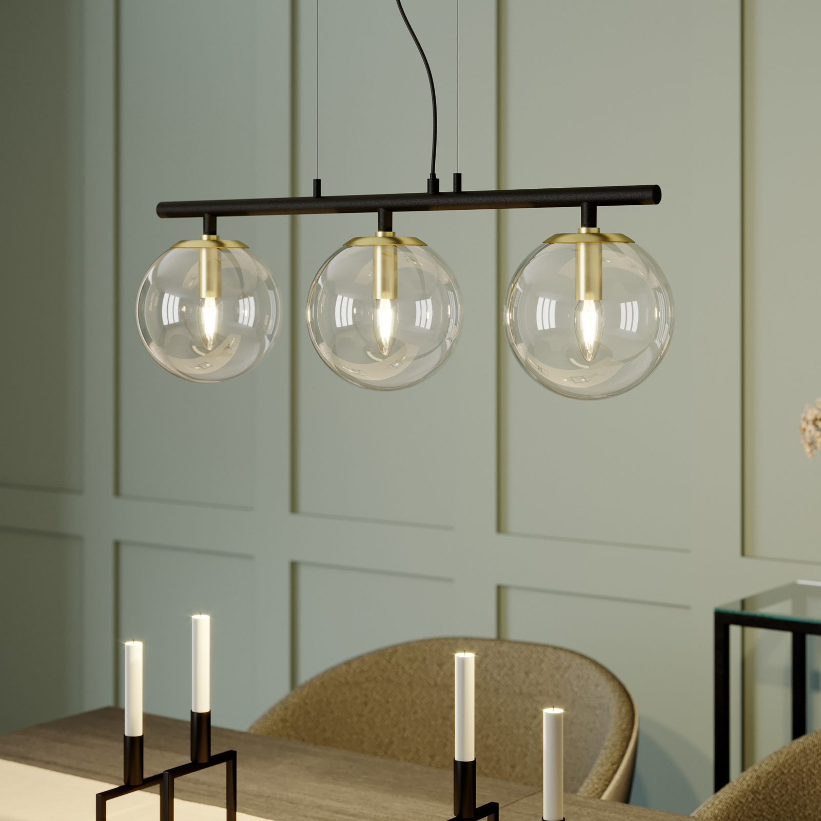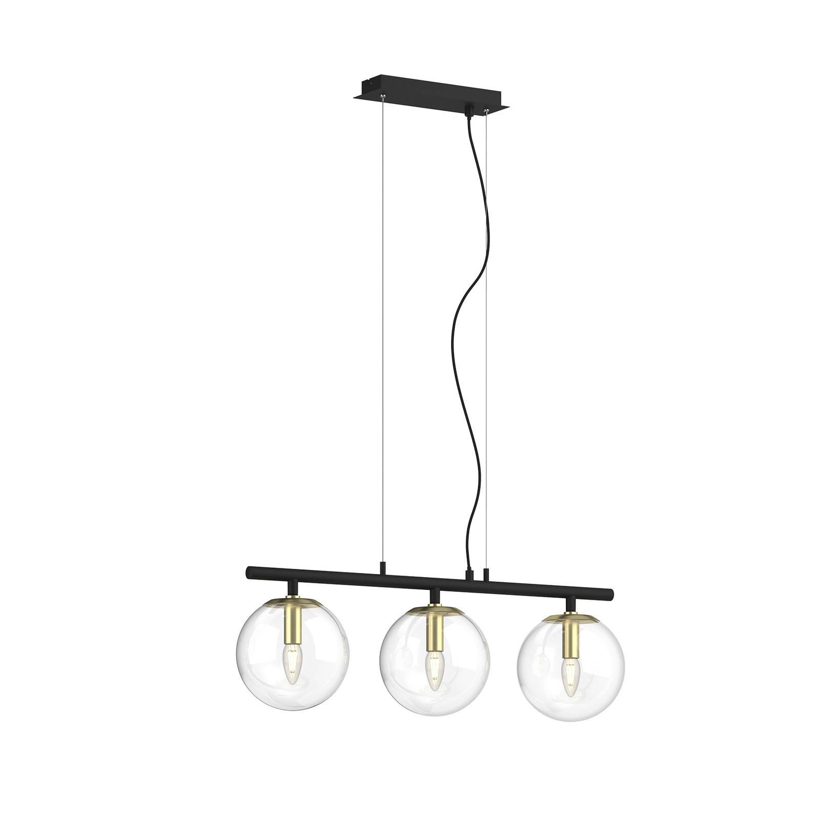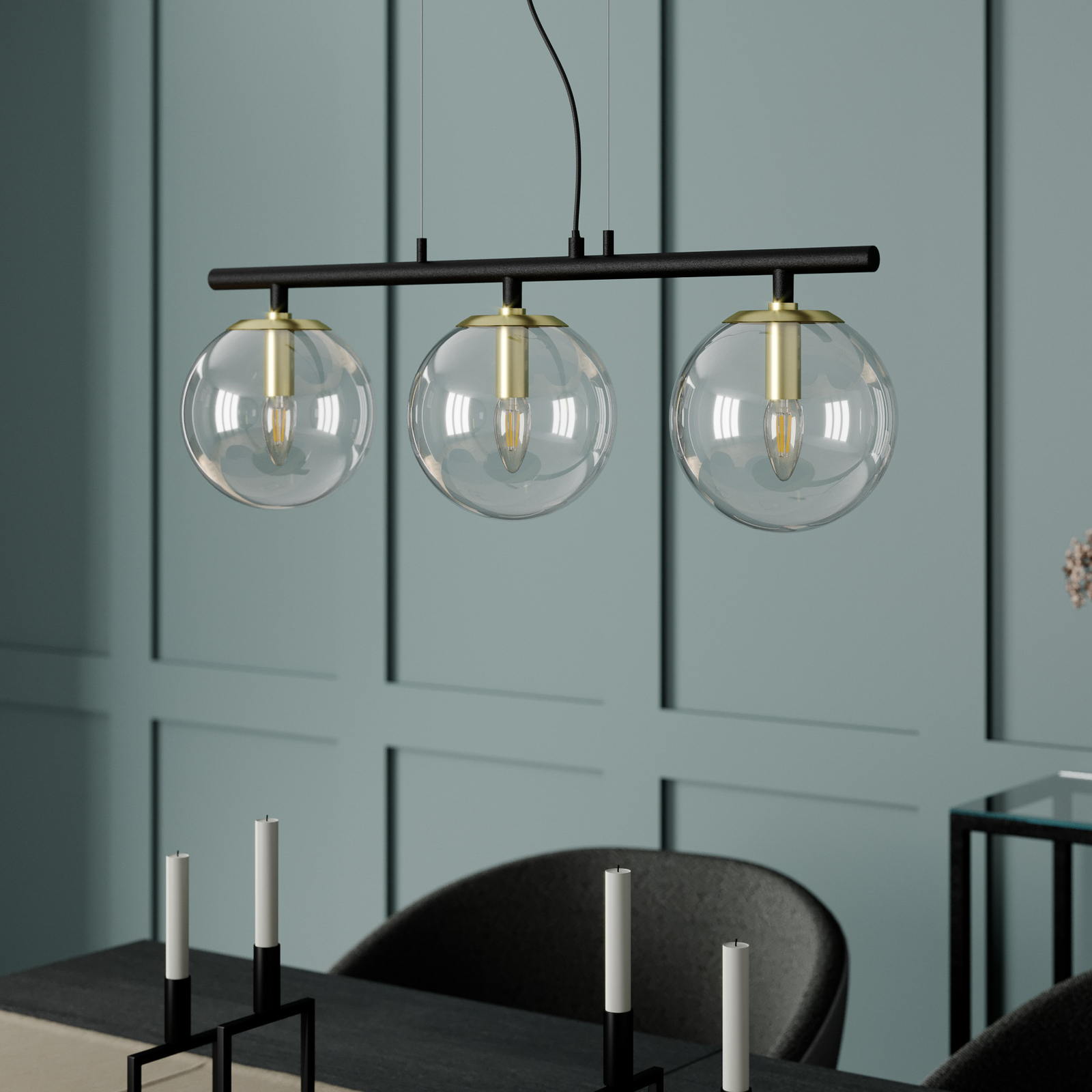 Sotiana-riippuvalaisin ihastuttaa tyylikkäällä kolmiosaisella muotoilullaan. Valaisin koostuu mustista metalliosista, kuten kattokiinnikkeestä, ja selvästi erottuvista messinginvärisistä lampunpitimistä. Pallon muotoiset varjostimet ovat kirkasta lasia ja sulautuvat vaivatta osaksi valaisimen tyylikästä muotoilua. Lasipallojen sisällä olevat lamput ovat esteettä näkyvillä, joten valaisimeen kannattaa valita sen tyyliin sopivat lamput. Tähän valaisimeen sopivat erinomaisesti pisaranmuotoiset E14-LED-filamenttilamput. Tyylikäs muotoilu on kuin uusi tulkinta klassisesta valaisinsarjasta ja tuo sisustukseen ripauksen luksusta. Yksilöllinen riippuvalaisin sopii hienosti moniin erilaisiin sisustustyyleihin.