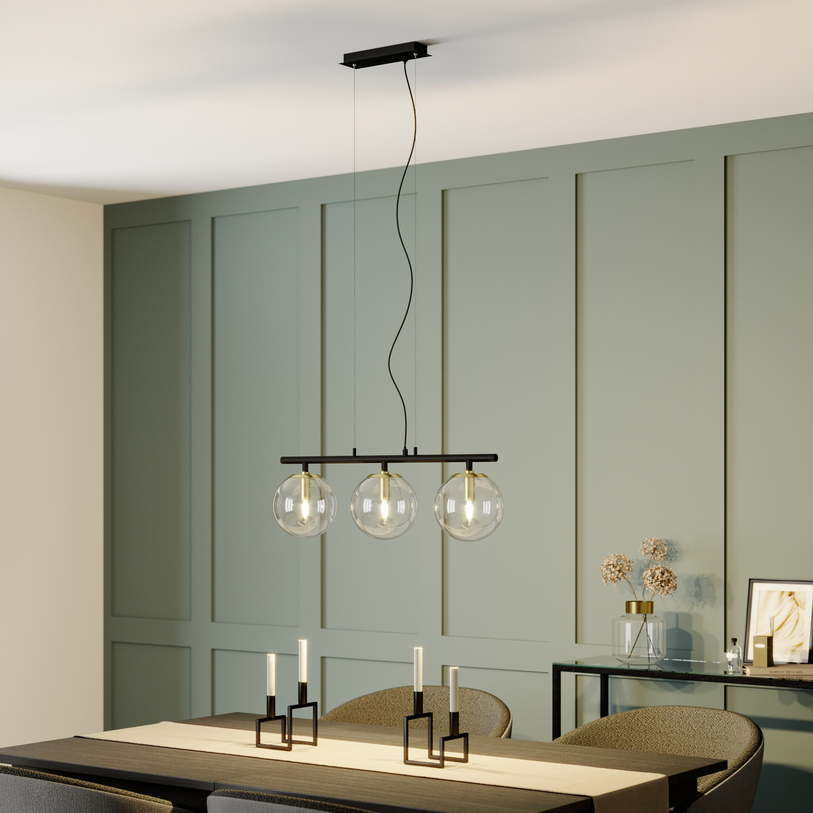 Pitkänmuotoinen, kolmilamppuinen Sotiana-riippuvalaisin sopii erinomaisesti ruokapöydän yläpuolelle, jossa se valaisee pöytäpinnan kauniisti ja riittävän kirkkaasti.