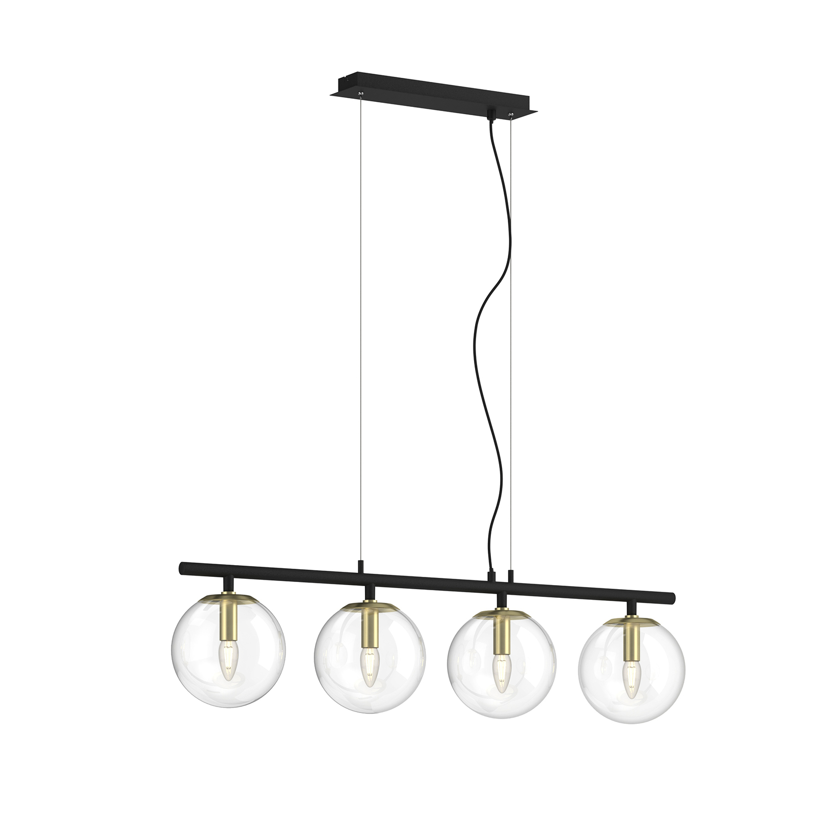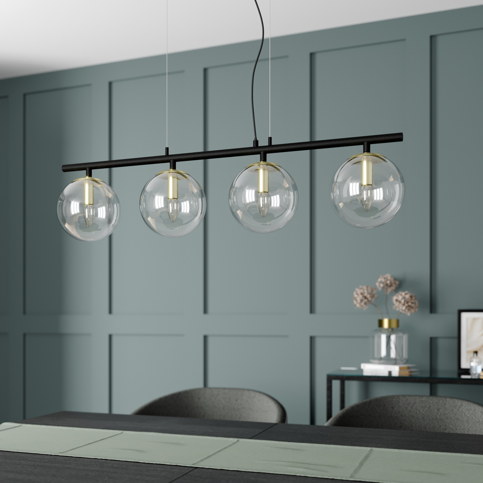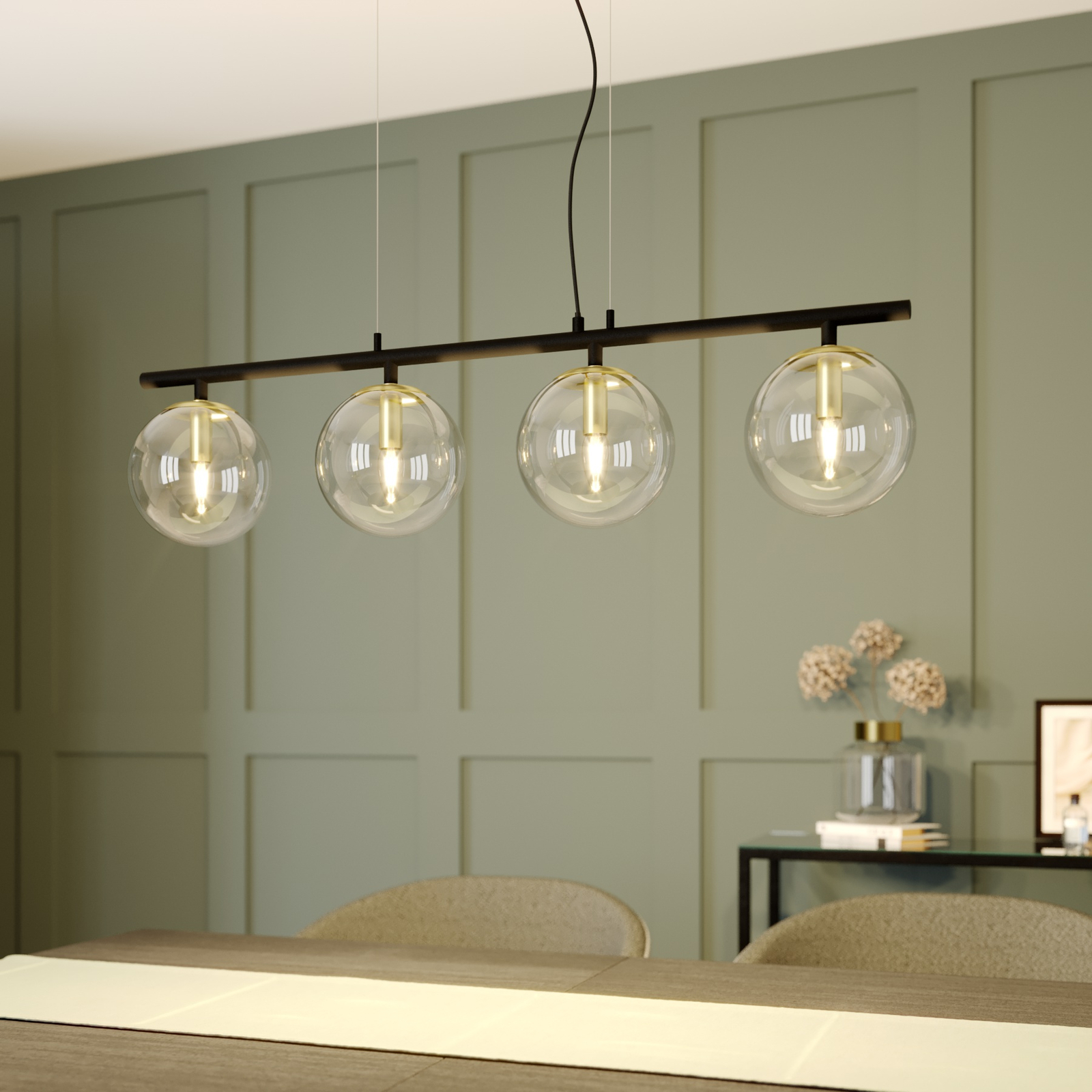 Modernissa Sotiana-valaisimessa on ripaus vintage-tyyliä. Valaisin on tietyllä tavalla uusi tulkinta erittäin klassisesta valaisinsarjasta. Runko, kattokiinnike ja palkit ovat mustaa metallia ja tyylikkäät lampunpidikkeet messinkiä. Yhdessä lasimateriaalin kanssa ne muodostavat kolmiosaisen, kauniin kokonaisuuden. Pitkänmuotoinen, nelilamppuinen tankoriippuvalaisin sopii ihanteellisesti ruokailuhuoneen pöydän yläpuolelle. Lasiosat on nopea ja helppo irrottaa asennusta ja lampun vaihtoa varten.