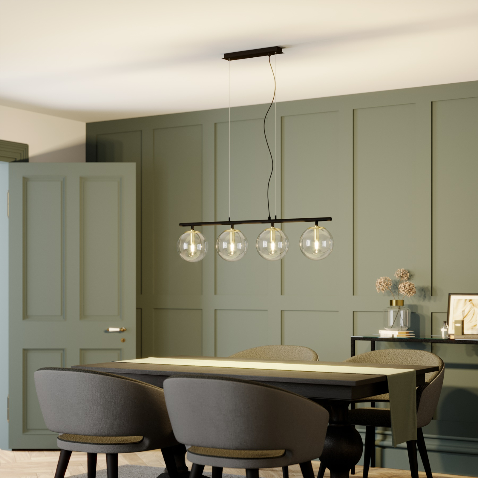 Sotiana on palkkimallinen design-riippuvalaisin, jossa on neljä kauniisti muotoiltua, kirkkaasti kiiltelevää lasipalloa. Näin varmistetaan, ettei lamppujen valotehosta mene mitään hukkaan. Lamput ovat esteettä näkyvillä, joten valaisimeen kannattaa valita tyyliin sopivat lamput. Tähän valaisimeen sopivat erinomaisesti pisaranmuotoiset LED-filamentti- ja rustiikkilamput.