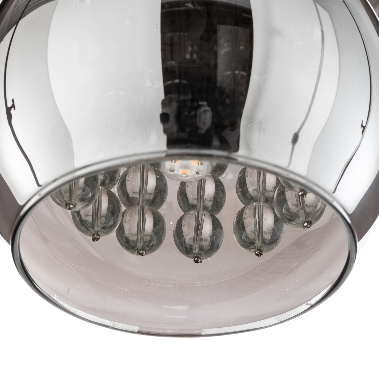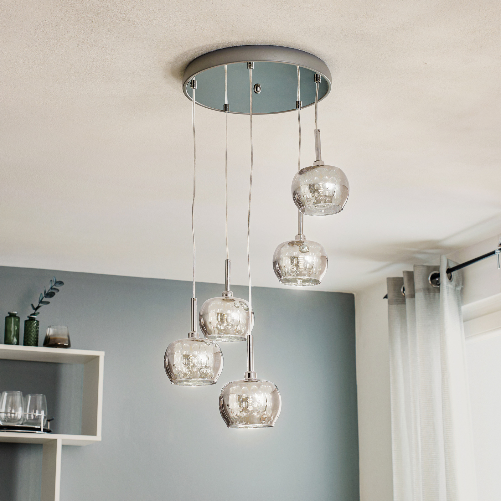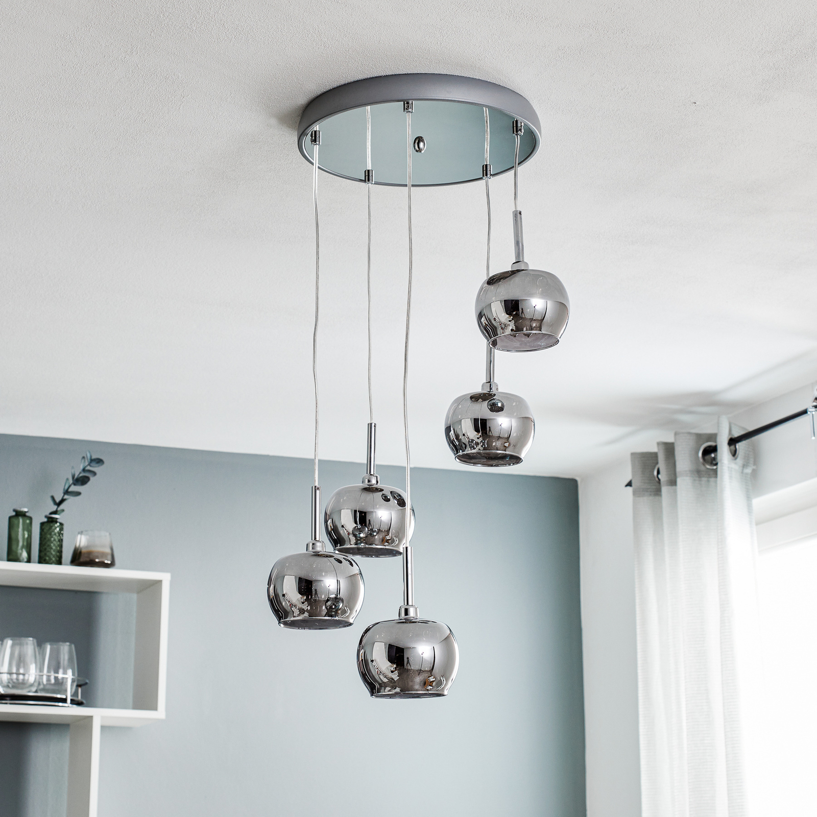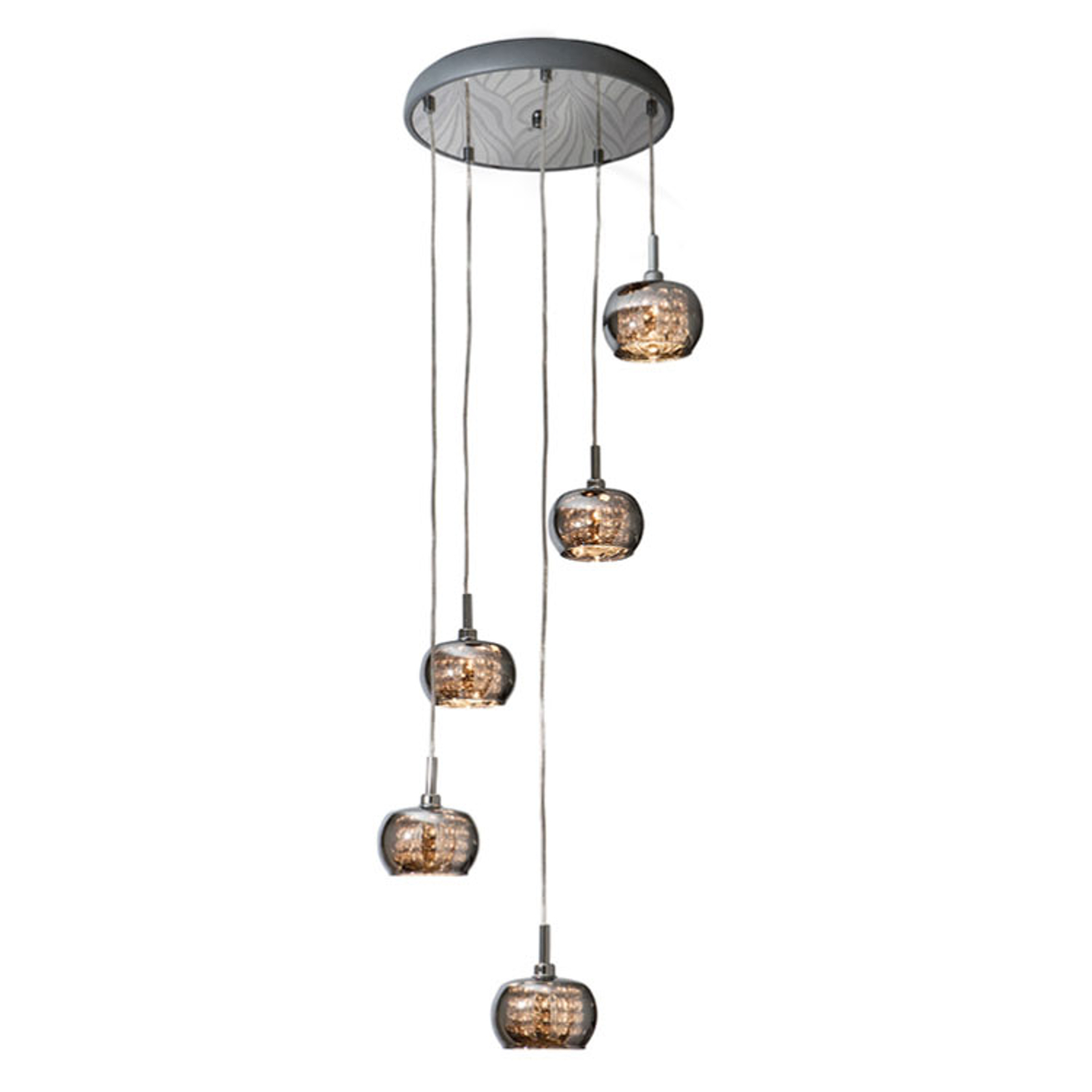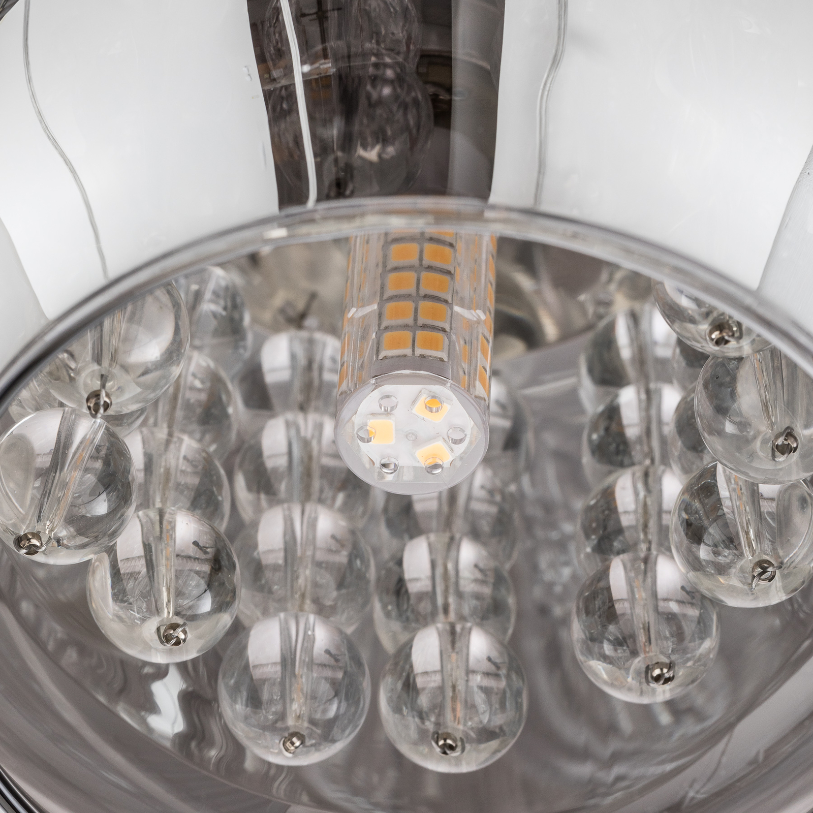 Esimerkiksi viiden lampun Arian-LED-riippuvalo näyttää erittäin koristeelta kulmapöydän yläpuolella olohuoneen oleskelutilassa. Hohtavat, krominväriset lasisävyt on varustettu kristalliketjuilla, jotka saadaan kimaltelemaan käytettyjen valaisimien lähettämän valon avulla. Yksittäisten sävyjen ripustamisen eri korkeuksien vuoksi jokainen varjostin tulee omaansa ja luo erittäin lumoavan valotehosteen.