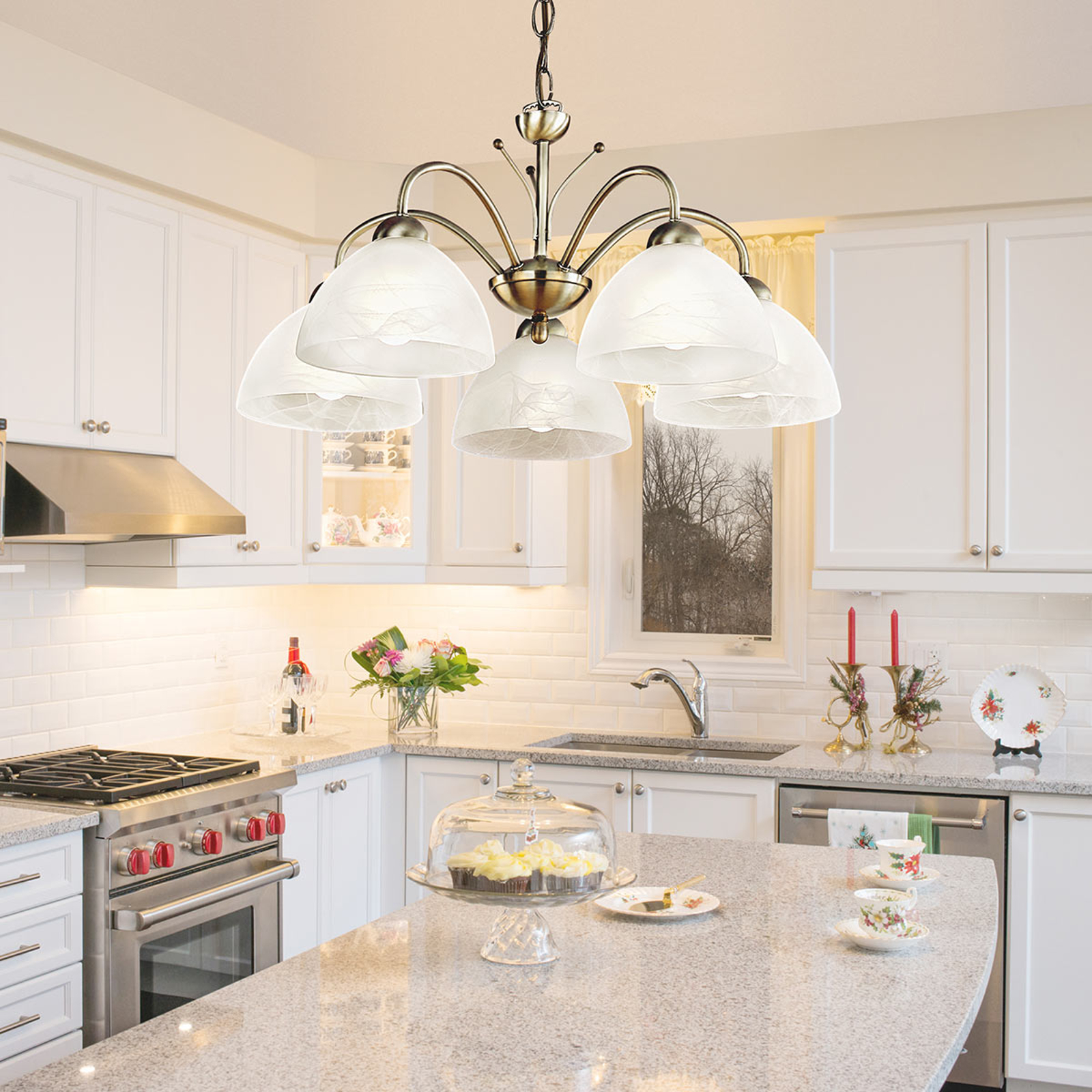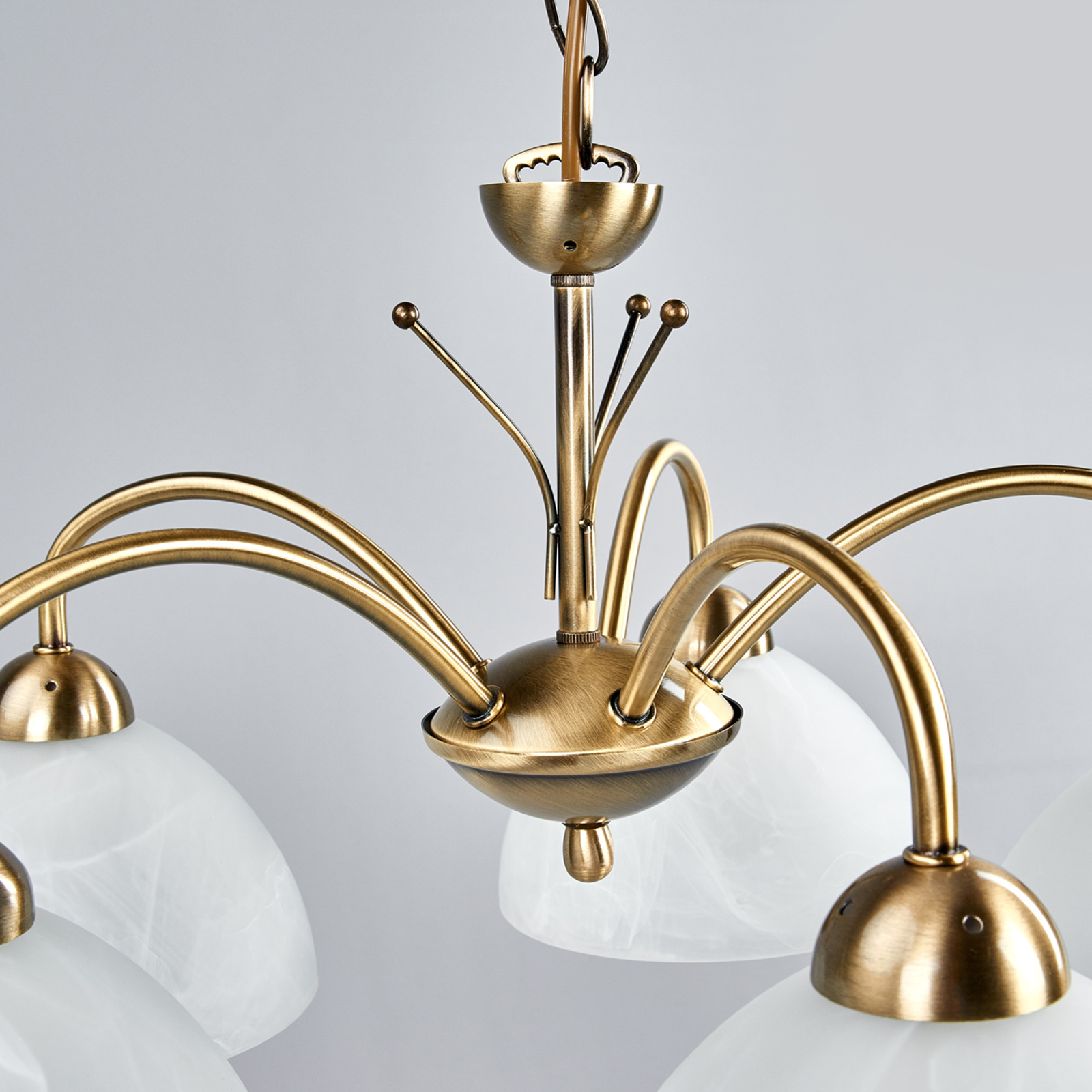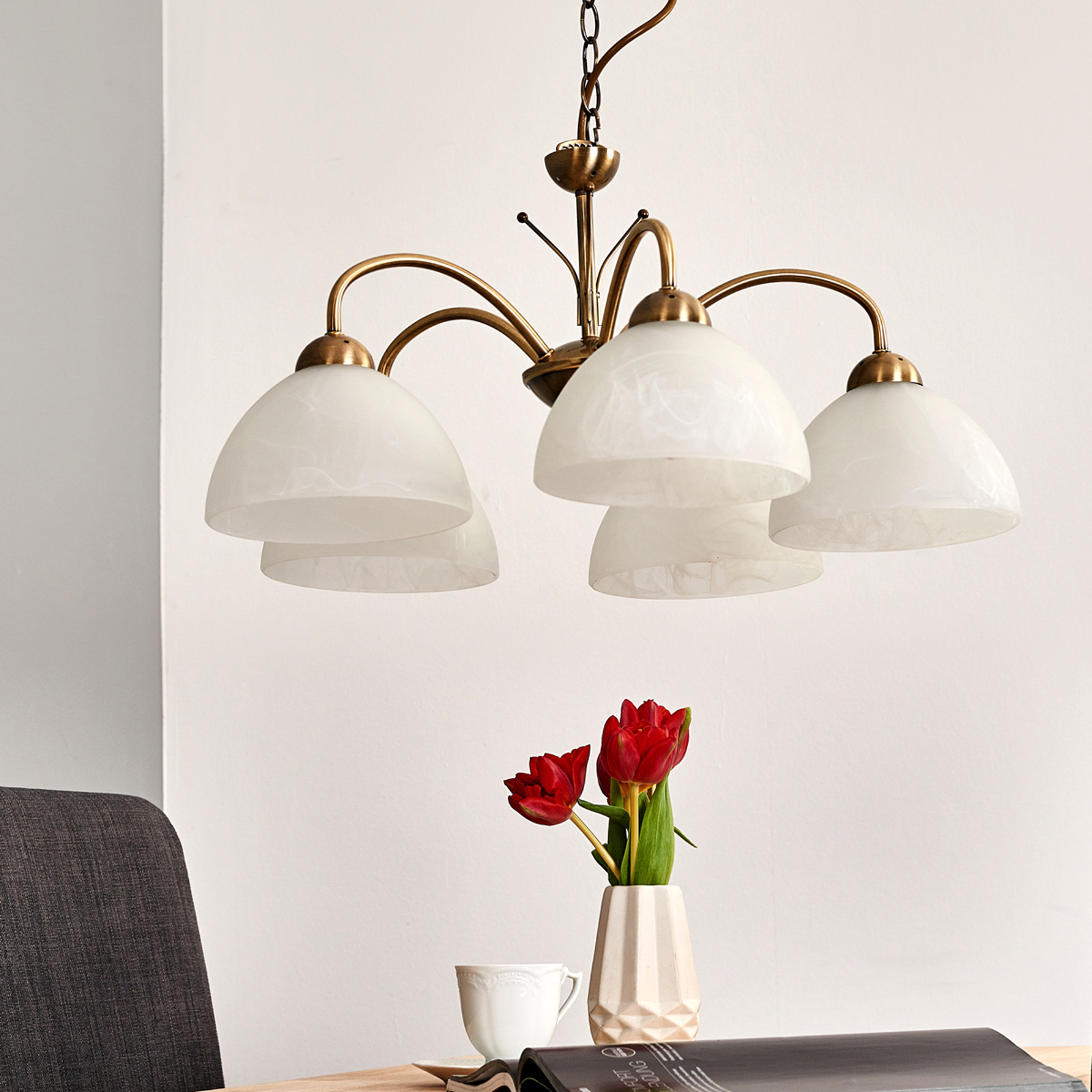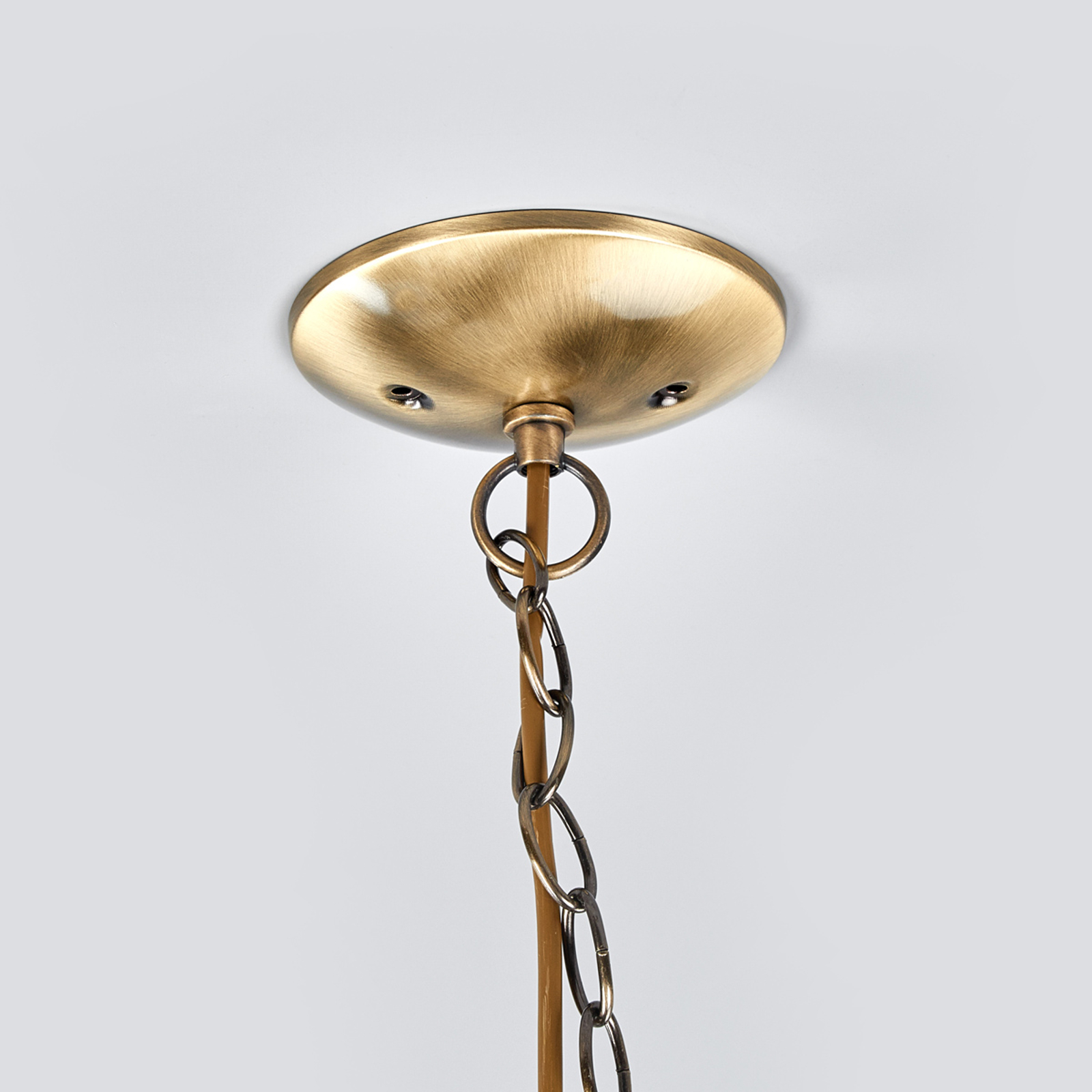 Klassinen MILANESE-riippuvalaisin antaa viehättävän ja tyylikään vaikutelman. Kauniin muotoiset valkoiset alabasterilasivarjostimet luovat pehmeän, kirkkaan valon. Metallinen vanhamessingin värinen valaisimen kruunu ja ketjuripustus täydentävät riippuvalaisimen harmoniseksi kokonaisuudeksi.